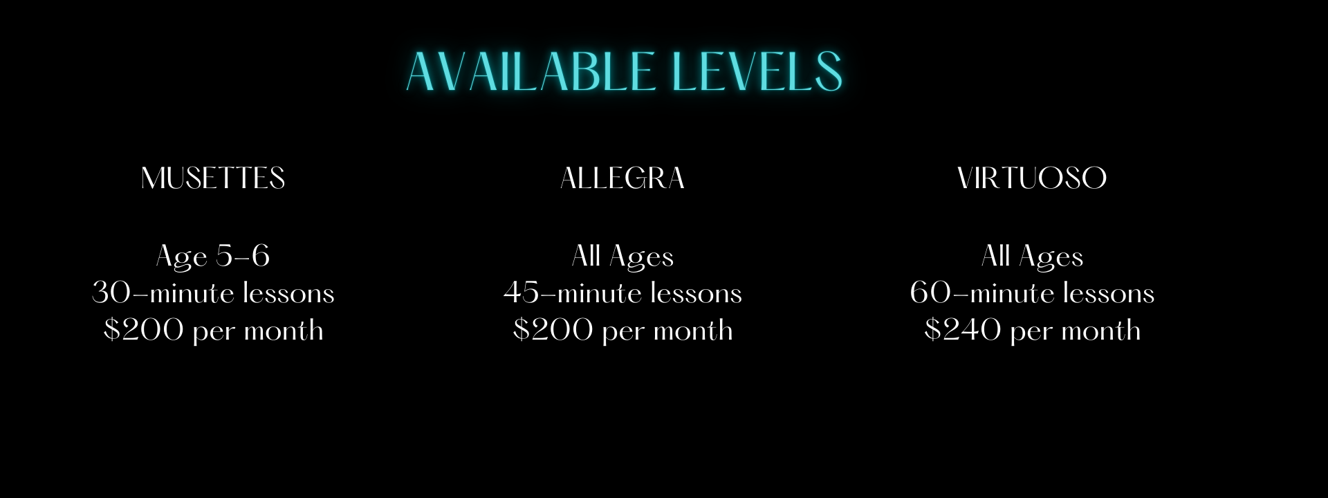 Tuition for lessons is paid for in advance and reserves your child’s (ren) weekly time slot for lessons. Tuition is due on the 1st of each month. If payment is not received by the 3rd of the month, a $15 late fee will be incurred. If tuition has not been paid in full by the 5th of the month, lessons will be suspended until payments and late fees are made. A one-time registration fee of $30 is due each year at the time of enrollment. Payments are due in full and are nonrefundable.